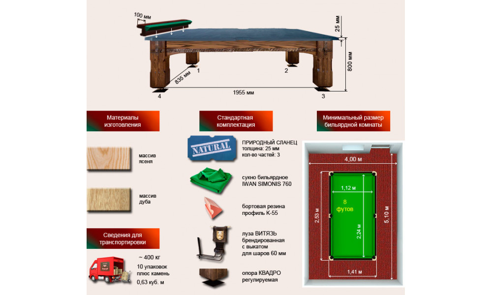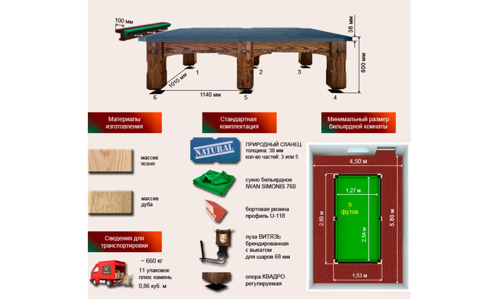 отборный массив ясеня или дуба, без шпонирования и металлокаркасов. К бильярдному столу "Витязь-Премиум" предлагаются светильник и киевница, выполненные в том же стиле, с элементами ручной ковки.